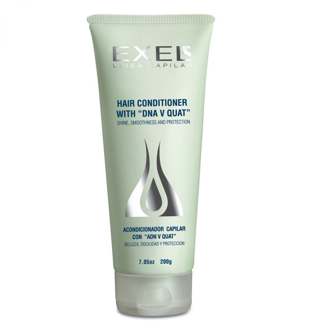Biocosmética Exel Argentina es el primer laboratorio en el mundo que ha logrado formar un complejo de carga positiva asociado a ADN vegetal para uso cosmético. El ADN V QUAT capta gran cantidad de moléculas de agua y actúa formando una película protectora sobre la estructura capilar que humecta profundamente acondiciona, suaviza y otorga brillo.