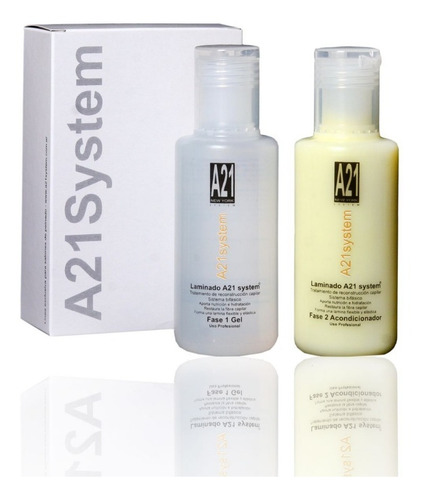 LAMINADO BIFASE A21 System Contiene: Fase 1 x 300ml Fase 2 x 300ml Sistema de reconstrucción capilar a base de tónicos vegetales y de aplicación artesanal exclusiva en salones de peinado. Una combinación de componentes tonificantes y selladores, con ocupación de espacios en la fibra capilar desde el interior al exterior. Laminando todo tipo de cabello. La acción combinada del GEL y ACONDICIONADOR / SELLADOR, otorgan al cabello nutrición profunda con importante sellado de los espacios intermoleculares y un total laminado elástico . Restaura la fibra capilar , aporta nutrientes vegetales tonificantes. Forma una lamina flexible y elástica en el cabello. Otorga sedosidad y brillo. Protege del sol, cloro, sales minerales y contaminación ambiental. Reduce la estática del pelo. Prolonga la duración del color. Recomendado para cabellos secos y los pasados por procesos químicos. Antes del planchado. Antes del Brushing. Una aplicación cada 30 días. Uso: Fase 1 GEL: Lavado del cabello con shampoo neutro A21 System. Secar con toalla, aplicar GEL mecha por mecha y suministrar calor seco 15 minutos. Enjuagar. Fase 2 ACONDICIONADOR / SELLADOR: Aplicar sobre el cabello. Masajear artesanalmente. Dejar actuar 3 minutos. Enjuagar, peinar o dejar secar naturalmente.